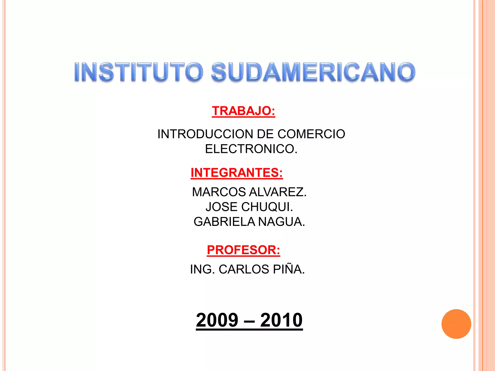 El documento presenta un proyecto de introducción de comercio electrónico realizado por Marcos Álvarez, José Chuqui y Gabriela Nagua para el Instituto Sudamericano bajo la supervisión del profesor Ing. Carlos Piña durante 2009-2010. Explica brevemente que el comercio electrónico se refiere a transacciones comerciales realizadas a través de Internet y menciona algunas ventajas y ejemplos de tiendas de comercio electrónico como Amazon.