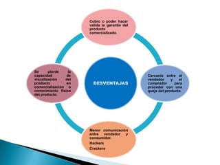 Este documento introduce el concepto de comercio electrónico y sus ventajas. Explica que el comercio electrónico involucra la compra y venta de productos y servicios a través de Internet y otras redes, usando medios de pago electrónicos como tarjetas de crédito. Entre las ventajas se encuentran mejoras en la distribución, comunicaciones comerciales electrónicas las 24 horas y beneficios operacionales como reducción de errores y costos. Además, describe los tipos principales de comercio electrónico como B2B,
