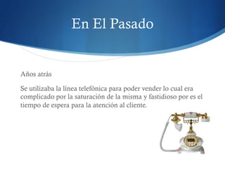 El documento describe la evolución del comercio electrónico desde el pasado hasta el presente. En el pasado, las ventas se realizaban principalmente por teléfono, lo que era complicado debido a la saturación de las líneas. En la actualidad, el comercio electrónico se realiza principalmente en Internet de forma rápida y revolucionó la forma de comprar. Hoy en día, las compras digitales se pueden realizar desde cualquier dispositivo móvil y se han sustituido los servicios en las tiendas físicas por máquinas.