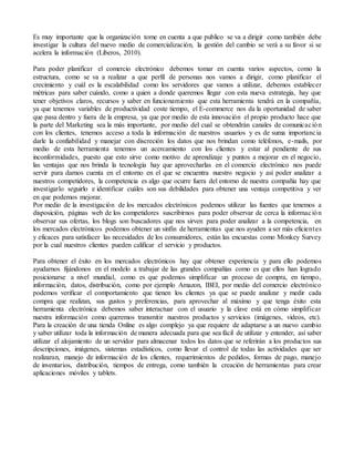 El documento describe el comercio electrónico (e-commerce) como una herramienta tecnológica global que permite realizar negocios de manera más rápida. Explica que el e-commerce ofrece ventajas para empresas como reducir costos, mejorar la distribución, y acceder a mercados mundiales. También brinda beneficios a los consumidores al facilitar la búsqueda y comparación de productos. No obstante, las empresas deben gestionar cuidadosamente los cambios requeridos y proteger la información personal de los clientes.