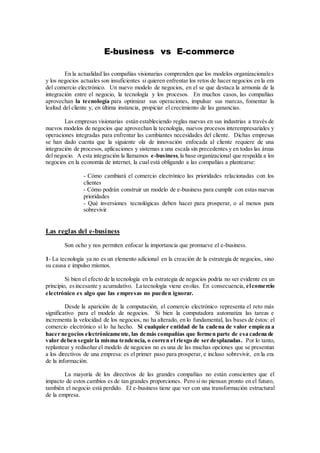 El documento describe las diferencias entre e-business (comercio electrónico) y e-commerce (comercio electrónico), y las reglas clave para el éxito del e-business. Explica que el e-business requiere una transformación estructural para centrarse en la experiencia del cliente, la optimización de la información y las alianzas flexibles. También destaca que los modelos de negocios exitosos del futuro se basarán en comunidades reconfigurables de e-business para satisfacer mejor las necesidades de los clientes.