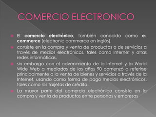 El comercio electrónico, o e-commerce, se refiere a la compra y venta de productos y servicios a través de medios electrónicos, especialmente internet. Este documento destaca las ventajas y desventajas del comercio electrónico, así como sus diferentes tipos, incluyendo B2B, B2C, y B2E. También se menciona el uso del e-mail marketing y se proporciona una lista de sitios web de comercio electrónico.
