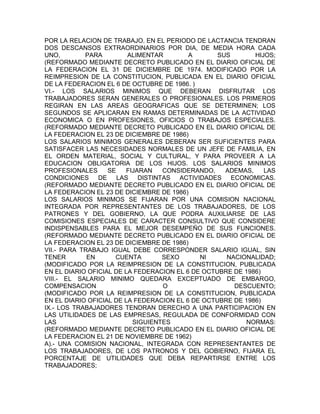 Este artículo establece los derechos laborales de los trabajadores mexicanos. Detalla las jornadas máximas de trabajo, salarios mínimos, participación en utilidades, descansos obligatorios, prohibición del trabajo infantil y condiciones para mujeres embarazadas. También requiere que los empleadores proporcionen vivienda, educación, servicios médicos y capacitación a los trabajadores.