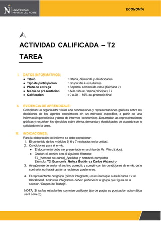 Este documento presenta la tarea 2 de Economía sobre oferta, demanda y elasticidades. Se solicita a los estudiantes completar un organizador visual con conclusiones y gráficas sobre el mercado de la carne de pollo en Perú considerando factores como tipo de bien, bienes complementarios y sustitutos. También se pide determinar el equilibrio del mercado durante la cuarentena de 2020 y resolver ejercicios sobre elasticidad aplicando funciones de demanda y oferta.