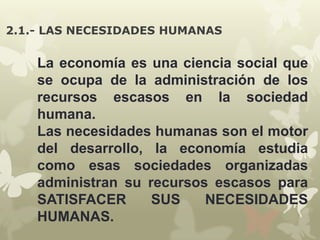El documento aborda las necesidades humanas y su clasificación, destacando la importancia de la economía en la satisfacción de estas necesidades a través de los recursos escasos. Se identifican tres categorías principales: necesidades primarias, secundarias y superfluas, y se describen características como la subjetividad, la ilimitación y la jerarquización de las necesidades. Además, se menciona la jerarquía de necesidades de Abraham Maslow, que incluye necesidades fisiológicas, de seguridad, pertenencia, estima y autorrealización.