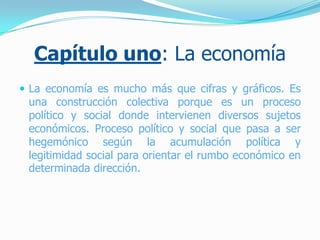 Este documento presenta resúmenes de 8 capítulos diferentes. El Capítulo 1 discute cómo la economía es una construcción social y política. El Capítulo 2 trata sobre las diferentes ideologías entre economistas. El Capítulo 3 cubre el uso del dólar y la fuga de capitales. El Capítulo 4 describe el objetivo y métodos de las estadísticas. El Capítulo 5 analiza los impactos distributivos de la inflación. El Capítulo 6 examina el creciente poder financiero. El Capítulo 7 explora las causas subyacentes de las crisis de deuda. Y el
