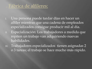 La división del trabajo y la especialización permiten una mayor productividad, como se puede ver en una fábrica de alfileres donde trabajadores especializados pueden producir mil alfileres al día. La división del trabajo también condujo al desarrollo del dinero como medio de intercambio para reemplazar el trueque, y el trabajo pasó a ser la medida fundamental del valor de los bienes.