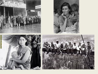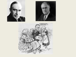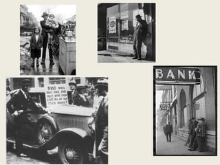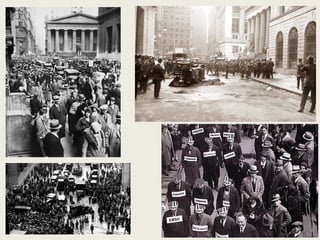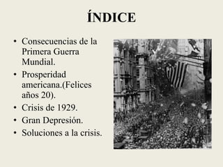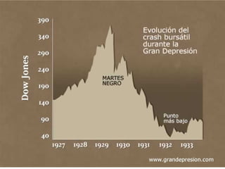 El documento resume la economía de la época de entreguerras (1919-1939). Tras la Primera Guerra Mundial, Europa sufrió destrucción, deudas de guerra y reparaciones, mientras que Estados Unidos prosperó. En los años 20 hubo auge económico en EEUU pero con desigualdades. La crisis de 1929 provocó quiebras bancarias, paro y depresión global. Países aplicaron soluciones keynesianas como gasto público, obras públicas y ayudas sociales para estimular la demanda.