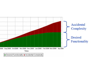 El documento discute la relación entre el desarrollo de software y las reglas del mercado, argumentando que las buenas prácticas y metodologías ágiles son rentables si se expresan en términos económicos. Se presentan conceptos como el coste de mantenimiento, la minimización de errores a través de técnicas como TDD y programación en pareja, y se enfatiza la importancia del tiempo de comercialización. Se utilizan ejemplos y referencias a expertos en el campo para apoyar estos puntos.