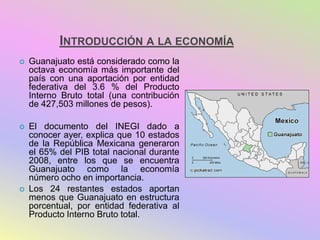 El documento resume la economía del estado de Guanajuato en México. Guanajuato tiene la octava economía más grande de México, contribuyendo el 3.6% al PIB nacional. El sector manufacturero, especialmente de maquinaria y equipo, contribuye el 26% al PIB estatal, seguido por servicios con un 20%. La agricultura, particularmente de maíz, sorgo y frijol, también juega un papel importante en la economía.