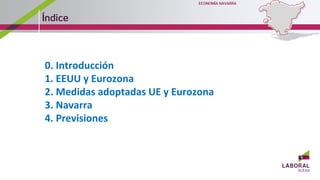 Este documento presenta las perspectivas económicas para 2021. Discutirá las respuestas de política económica de la UE y la Eurozona a la pandemia, así como los impactos en EEUU, Alemania, Reino Unido y España. Finalmente, analizará las previsiones económicas para Navarra en 2021 teniendo en cuenta la incertidumbre actual.