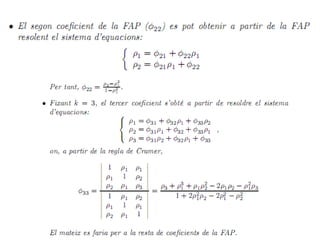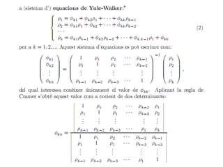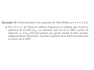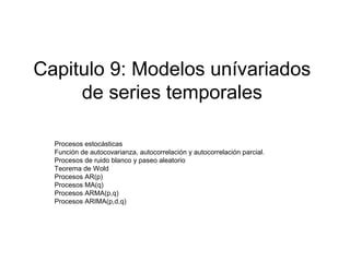 Este documento resume los modelos univariados de series temporales, incluyendo procesos estocásticos, funciones de autocovarianza y autocorrelación, procesos de ruido blanco y paseo aleatorio, y procesos AR, MA y ARMA. Explica cómo estimar los momentos muestrales de una serie temporal y analizar las propiedades de estacionariedad y linealidad de diferentes procesos estocásticos.