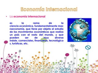 Este documento trata sobre la economía internacional. Explica conceptos clave como la ventaja comparativa, la especialización productiva, las exportaciones e importaciones. También describe los tipos de integración económica como áreas de preferencia aduanera, zonas de libre comercio y uniones aduaneras. Finalmente, analiza la globalización económica y los agentes que la impulsan como las empresas multinacionales y bancos.