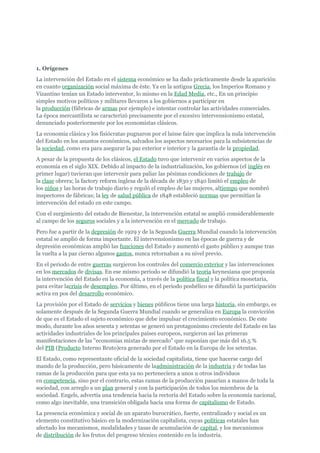 1. El documento describe la historia de la intervención estatal en la economía desde la antigüedad hasta la actualidad. Ha habido un aumento en la intervención estatal, especialmente después de las guerras mundiales y la Gran Depresión.