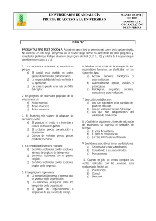 Este documento presenta las instrucciones para realizar un examen de Economía y Organización de Empresas para el acceso a la universidad en Andalucía, incluyendo la duración, estructura y valoración del examen, así como dos opciones de preguntas teóricas y problemas, y un test de 10 preguntas de opción múltiple.