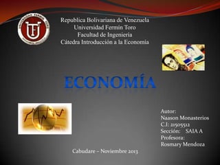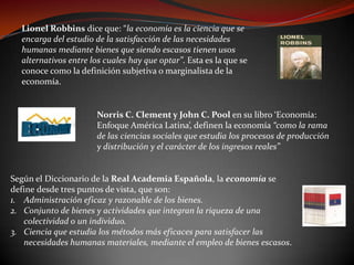 Este documento presenta diferentes definiciones de economía según autores como Robbins, Norris y Pool, así como la Real Academia Española. Explica los objetos de estudio de la economía como la asignación de recursos, mercados financieros, intervención estatal, distribución de ingresos, entre otros. Finalmente, describe cuatro fenómenos económicos importantes: crisis, devaluación, inflación y desempleo.