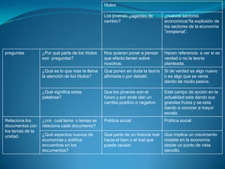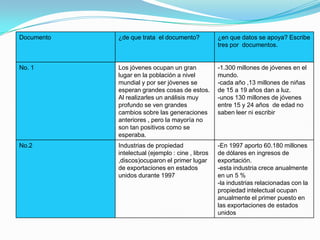 El primer documento discute el papel de los jóvenes en el mundo y las expectativas sobre ellos. Señala que aunque los jóvenes representan una gran parte de la población mundial, muchos enfrentan obstáculos como el desempleo, el reclutamiento en grupos armados, y el embarazo a temprana edad. El segundo documento habla sobre el auge de las industrias basadas en la propiedad intelectual como las películas, libros y música. Explica que estas industrias son un importante sector de exportación en Estados Unidos