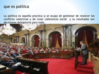 El documento trata sobre varios temas relacionados con la política y la economía en Colombia. Define la política como la gestión de los conflictos colectivos y la toma de decisiones delegadas. Explica que la política establece las leyes y deberes de un país para administrar justicia. Su objetivo debería ser beneficiar a todos los miembros de la sociedad buscando el bien común, aunque los políticos no siempre cumplen con esto. También habla sobre el estado, la administración política, y las relaciones entre la política, la economía y problemas como el dese