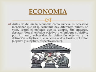  Antes dedefinir la economía como ciencia, es necesario mencionar que en la economía hay diferentes puntos de vista, según el enfoque que se adopte. Sin embargo, destacan dos: el enfoque objetivo y el enfoque subjetivo; por lo tanto, sobresalen la definición objetiva y la definición subjetiva, que refieren a dos teorías del valor (objetivo y subjetivo, respectivamente). ECONOMIA