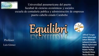 El documento trata sobre el concepto de equilibrio de mercado en economía. Explica que un mercado se encuentra en equilibrio cuando la cantidad demandada es igual a la cantidad ofertada, determinando así el precio y volumen de transacciones. Adicionalmente, define equilibrio económico como el estado en el que las fuerzas de oferta y demanda se encuentran balanceadas, sin motivos para que cambien los precios o cantidades. Varios autores concluyen que el punto de equilibrio permite determinar el volumen de ventas mínimo para que las empresas no ten