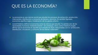 La economía estudia los procesos de producción, intercambio, distribución y consumo de bienes y servicios. Se divide en microeconomía, que analiza el comportamiento de unidades individuales como empresas y consumidores, y macroeconomía, que estudia agregados a nivel nacional como el consumo, ahorro e inversión. La economía internacional examina las relaciones económicas entre países. La economía es importante porque ayuda a satisfacer las necesidades humanas de manera eficiente y promueve el desarrollo económico y social.