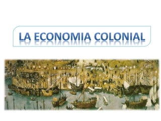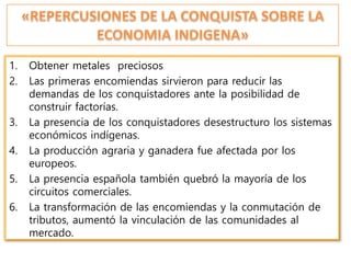 El documento analiza el impacto de la colonización española en la economía indígena, destacando la afectación de sistemas económicos y circuitos comerciales por la presencia de conquistadores y la transformación de encomiendas. La agricultura y la minería, especialmente de plata, emergieron como pilares de la riqueza colonial, mientras que el comercio colonial se caracterizó por su complejidad y el monopolio de Sevilla. A lo largo de los siglos, la producción artesanal y agrícola tuvo un papel relevante, pero el valor de las exportaciones coloniales disminuyó drásticamente.