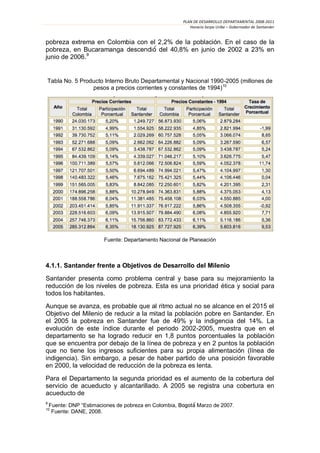 El documento presenta un diagnóstico económico y social de Santander. Señala que la economía de Santander ha crecido un 20,5% entre 1990 y 2006, pero existen grandes desigualdades entre el área metropolitana de Bucaramanga y las zonas rurales. Aunque se han logrado avances en algunos objetivos de desarrollo del milenio como educación y salud, todavía hay rezagos significativos en pobreza, acceso a servicios básicos, y desnutrición. El documento concluye resaltando la neces