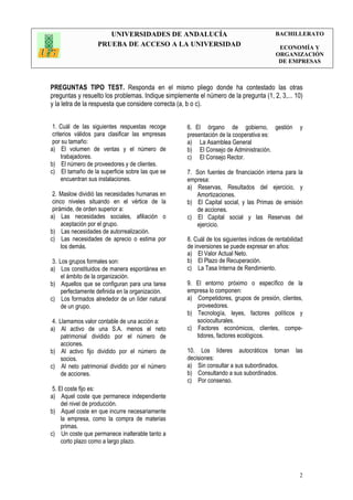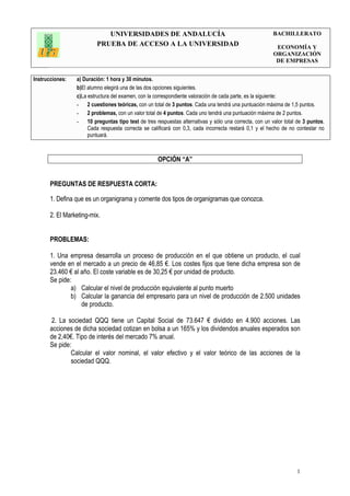 Este documento presenta un examen de acceso a la universidad en Economía y Organización de Empresas. El examen consta de dos opciones (A o B), cada una con preguntas teóricas y problemas para resolver, así como un test de 10 preguntas de selección múltiple. Se instruye a los estudiantes sobre la duración, estructura y puntuación del examen.