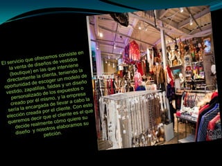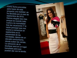 El documento presenta un resumen de la boutique Mazuyé, una tienda de ropa y accesorios fundada en 2012 por Marisol Juárez, Zurisadai García y Yessica Arrazola en la Ciudad de México. La boutique tiene como misión ofrecer productos de calidad a precios accesibles para satisfacer a sus clientas. Actualmente cuenta con 40 empleados y vende artículos como bolsos, ropa, zapatos y joyería. Los planes de la boutique incluyen expandir su inventario y llegar a más clientas a nivel nacional.