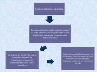 El documento habla sobre la relación entre los seres humanos y la naturaleza. Explica que esta relación es unitaria e implica una interacción recíproca, aunque los humanos han modificado la naturaleza para satisfacer sus necesidades, lo cual afecta sus propias condiciones de vida. También presenta los conceptos de planificación, organización y administración como elementos clave para optimizar los recursos disponibles de manera sostenible.