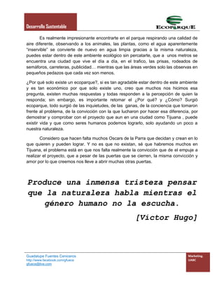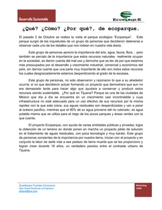 Un grupo de personas en Tijuana se dio cuenta de que los recursos naturales como el agua y la flora estaban siendo mal utilizados y desperdiciados debido al rápido crecimiento e industrialización de la ciudad. Ellos decidieron crear el parque ecológico Ecoparque para demostrar que es posible tratar las aguas residuales de manera sustentable y crear un hábitat para la vida silvestre en la ciudad. A través de 18 años de trabajo, transformaron un terreno baldío en un oasis verde que limpia el agua y of