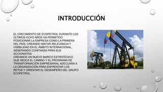Este documento presenta información sobre la misión, visión, objetivos e historia de Ecopetrol. Resume que Ecopetrol es la principal compañía petrolera de Colombia y se ha posicionado como líder en la industria a través de su crecimiento en los últimos años. Su misión se enfoca en operaciones rentables, sostenibles y de excelencia operacional para construir un mejor futuro.