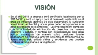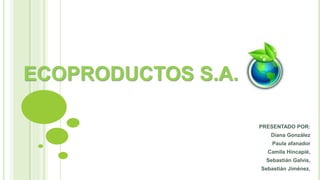Ecoproductos S.A. es una empresa dedicada a la fabricación de productos escolares y de aseo cuya política ambiental se basa en el compromiso social y la conservación del medio ambiente, enfocándose en el uso racional del agua y el cuidado del humedal y la quebrada cercanos. La empresa busca alcanzar el desarrollo sostenible de la región cumpliendo con las normas ambientales vigentes.