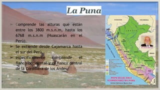 La Puna es una ecorregión de los Andes situada entre los 3800 y 6768 metros sobre el nivel del mar, que se extiende desde el norte de Perú hasta el sur. Se caracteriza por su relieve agreste con mesetas y cordilleras escarpadas, suelos de andosoles y paramosoles, y ríos de curso tranquilo. Tiene un clima frío con temperaturas promedio de 6°C, lluvias estivales de nieve, granizo y lluvia, y clima polar en las zonas más altas. Su flora inclu