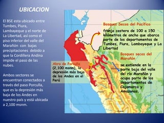 El documento describe dos tipos principales de bosque seco ecuatorial en el norte de Perú: los bosques secos del Pacífico a lo largo de la costa y los bosques secos del Marañón en el valle inferior del río Marañón. Estos bosques se caracterizan por bajas precipitaciones debido a la Cordillera de los Andes e incluyen varios tipos de vegetación como matorrales, árboles, sabanas y bosques de galería. La fauna incluye aves como el cóndor, mamíferos como el jaguar