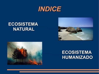 Un ecosistema natural es una unidad constituida por organismos que interactúan entre sí y con su ambiente físico, resultando en un flujo equilibrado de energía, agua y nutrientes. Cuando los humanos modifican la naturaleza para extraer recursos o habitarla, se originan ecosistemas humanizados como campos de cultivo y ciudades.