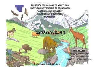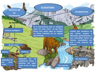 El documento presenta una introducción al ecosistema, definiéndolo como la interacción armónica entre seres vivos y su entorno, que incluye factores bióticos y abióticos. Se discute la competencia entre individuos de la misma o diferentes especies cuando compiten por recursos similares. Asimismo, se mencionan los tipos de competencia basados en su mecanismo y especies involucradas.