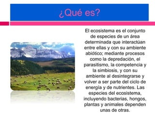 El ecosistema es el conjunto de especies que interactúan entre sí y con su ambiente en un área determinada. Existen ecosistemas acuáticos, terrestres y aéreos. La contaminación ha llevado a la extinción de muchas especies y la tasa actual de extinción es mucho mayor que la tasa natural, debido al impacto humano en el planeta.