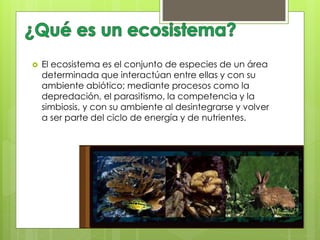  El ecosistemaes el conjunto de especies de un área determinada que interactúan entre ellas y con su ambiente abiótico; mediante procesos como la depredación, el parasitismo, la competencia y la simbiosis, y con su ambiente al desintegrarse y volver a ser parte del ciclo de energía y de nutrientes.