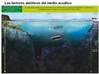 El documento describe los conceptos básicos de la ecología y los ecosistemas. Explica que la ecología estudia las relaciones entre los organismos y su medio ambiente. Define un ecosistema como una zona donde las condiciones ambientales permiten el desarrollo de organismos específicos, que incluye el biotopo (medio físico) y la biocenosis (conjunto de seres vivos). También describe los factores abióticos y bióticos que afectan a los organismos y sus adaptaciones.
