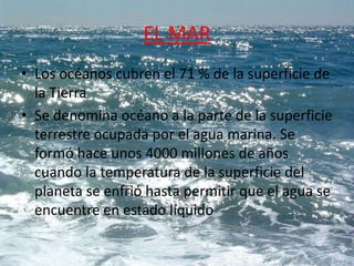 El documento proporciona información sobre varias especies marinas como tiburones, peces y moluscos. Los océanos cubren el 71% de la Tierra y se formaron hace unos 4,000 millones de años. Se describen especies como el tiburón blanco, el axolote, el tiburón con volantes, el tiburón ballena, la babosa marina azul y el raro tiburón boquiancho.