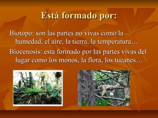 El documento describe el ecosistema selvático, el cual se caracteriza por su gran diversidad. Está formado por el biotopo que incluye elementos no vivos como la humedad y la temperatura, y la biocenosis con partes vivas como monos y plantas. La selva tiene altas temperaturas entre 20°C y 30°C y humedad, y alberga gran flora y fauna en un entorno bello.