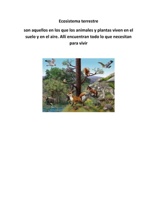 Los ecosistemas terrestres consisten en animales y plantas que viven en el suelo y el aire, donde encuentran todo lo necesario para sobrevivir, como alimento, agua y refugio.