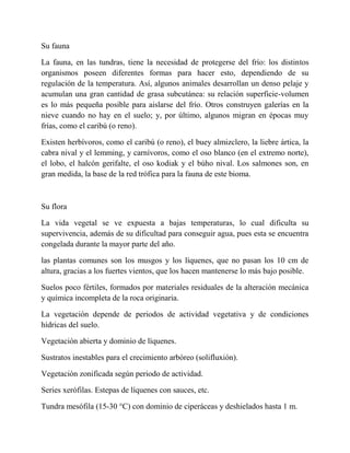 La tundra es una región biogeográfica polar ubicada más allá del límite de los árboles, con inviernos extremadamente fríos y veranos cortos y frescos. Su clima polar crea suelos permanentemente congelados y cubiertos de nieve e hielo. La flora de la tundra incluye musgos y líquenes bajos que sobreviven a las bajas temperaturas, mientras que la fauna como el caribú, el oso polar y el lemming han evolucionado pelajes gruesos y la migración