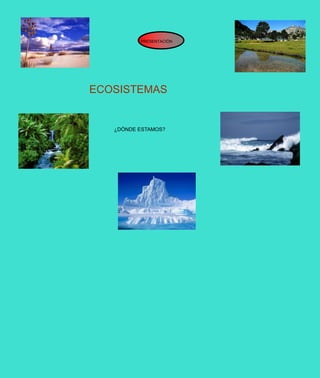 Este documento presenta diferentes ecosistemas (desierto, montaña, selva, polar y mar) y los animales que los habitan. Explica las características de los animales como su alimentación, si tienen esqueleto o no, plumas, escamas o pelo. También incluye actividades para que los estudiantes coloquen los animales en su hábitat correspondiente y adivinen en qué ecosistema se encuentran basándose en sus características.
