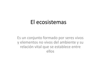 Este documento describe los diferentes tipos de ecosistemas, incluyendo terrestres como bosques, tundra y desiertos, y acuáticos como marinos fóticos y afóticos y de agua dulce. Explica que un ecosistema es un conjunto formado por seres vivos y elementos no vivos del ambiente y su relación vital. Además, señala que los ecosistemas son de gran importancia para la humanidad porque generan el equilibrio natural en el planeta.