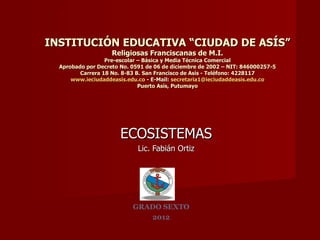 Este documento presenta un resumen de 3 oraciones o menos sobre el tema de ecosistemas. Explica que un ecosistema está formado por factores bióticos como plantas y animales, y factores abióticos como la luz, temperatura y agua. Además, describe las interacciones entre los organismos de un ecosistema, incluyendo depredación, competencia, parasitismo y mutualismo. Finalmente, menciona que los ecosistemas incluyen acuáticos, terrestres y aquellos modificados por humanos.