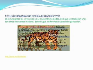 El documento describe tres niveles de organización externa de los seres vivos: el individuo, que es un ser vivo distinguido por su forma, tamaño y hábitat; la población, que consiste en individuos de la misma especie que habitan en un área geográfica; y el ecosistema, que incluye a las comunidades bióticas que interactúan en un hábitat compartido con factores abióticos.
