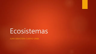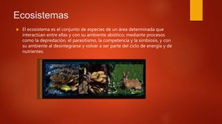 Los ecosistemas son conjuntos de especies que interactúan entre sí y con su ambiente. La biodiversidad incluye diversos niveles de organización biológica como especies, variabilidad genética y ecosistemas. Los ecosistemas y la biodiversidad son vitales para la Tierra al proveer aire, comida, agua y bienestar. Los bosques tropicales albergan gran cantidad de especies y son importantes ecosistemas a pesar de su tala continua.