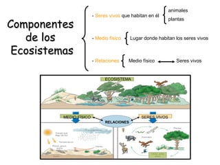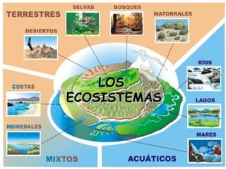 El documento describe los componentes básicos de los ecosistemas, incluidos los seres vivos, el medio físico y las relaciones entre ellos. Explica los diferentes tipos de ecosistemas como terrestres, acuáticos, naturales y humanizados, así como los biomas principales como los bosques tropicales, templados y la tundra. También analiza los impactos humanos tanto perjudiciales como beneficiosos en los ecosistemas.